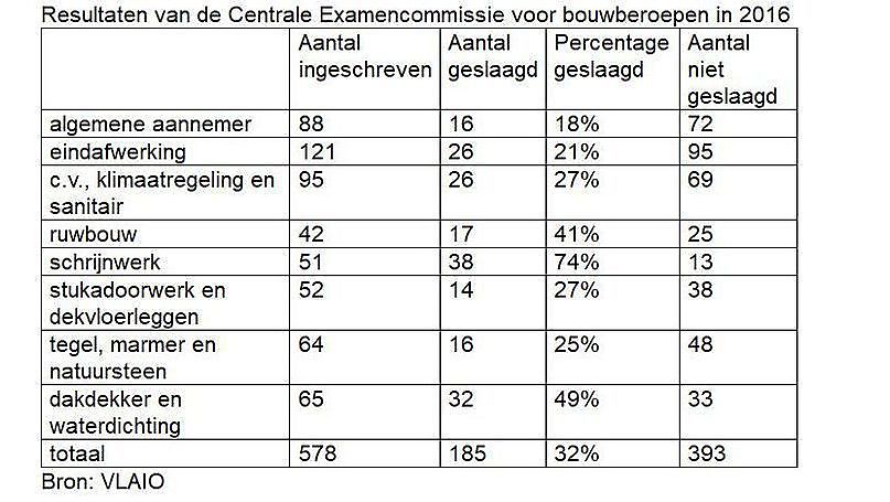 Intussen heeft de VCB de officiële slaagcijfers bij die commissie kunnen opsporen via de jaarverslagen van het VLAIO (Vlaams Agentschap Innoveren en Ondernemen). Gemiddeld gezien, lag het slaagcijfer bedroevend laag: slechts 1 op 3 slaagde. Het examen handelt zowel over de administratieve kennis als over de sectorale beroepsbekwaamheid. Beide aspecten zijn cruciaal om een bouwbedrijf te leiden. De afschaffing van de vestigingsregels wordt verdedigd met het argument dat starters minimaal mogen worden belemmerd. Voor de bouw is er op dat vlak echter geen probleem. In 2015 telde de Vlaamse bouw 4.588 starters. Dat aantal steeg in 2016 tot 4.956 en in 2017 tot 5.277. Starters vertegenwoordigden in 2017 in de bouw een aandeel van 7,3% in het totale aanbod van 72.032 Vlaamse bedrijven tegenover 7,8% voor alle sectoren samen. De VCB is vooral bezorgd om de kwaliteit van de startende bouwbedrijven en wil de belangen van de consument beschermen.