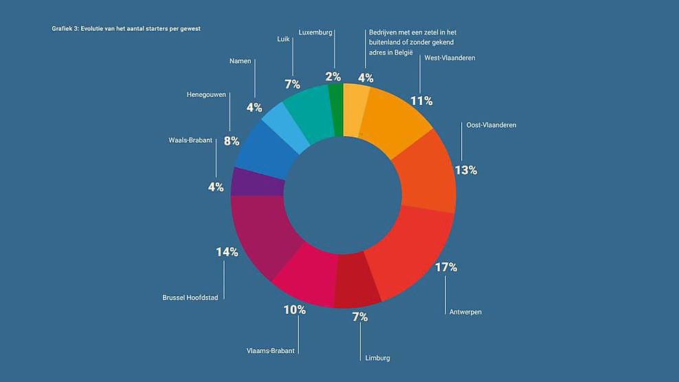 Het aantal starters steeg het meest in Vlaanderen. In 2018 waren het er 58.230, of 6.043 meer dan het jaar ervoor. Ook in het Brussels Hoofdstedelijk Gewest nam het aantal starters verder toe (+ 5,33%), waarmee de teller voor 2018 op 13.112 eenheden komt. In Wallonië daarentegen is er een minimale daling van het aantal starters merkbaar (- 0,20%), maar het totaal van 24.457 ondernemingen in 2018 is eerder een status quo.